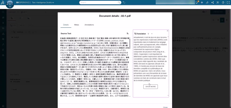 Functional Value On Annotate and Explore modules of Text Intelligence Studio, when a document is selected, it's possible to automatically translate it to an another language. It saves Data Linguist time and boosts its efficiency. User Experience Value Accelerate user efficiency with automatic document translation Document translation in the context of Natural Language Processing (NLP) is very important because : - projects may deals with multi-lingual datasets, or multi-national user