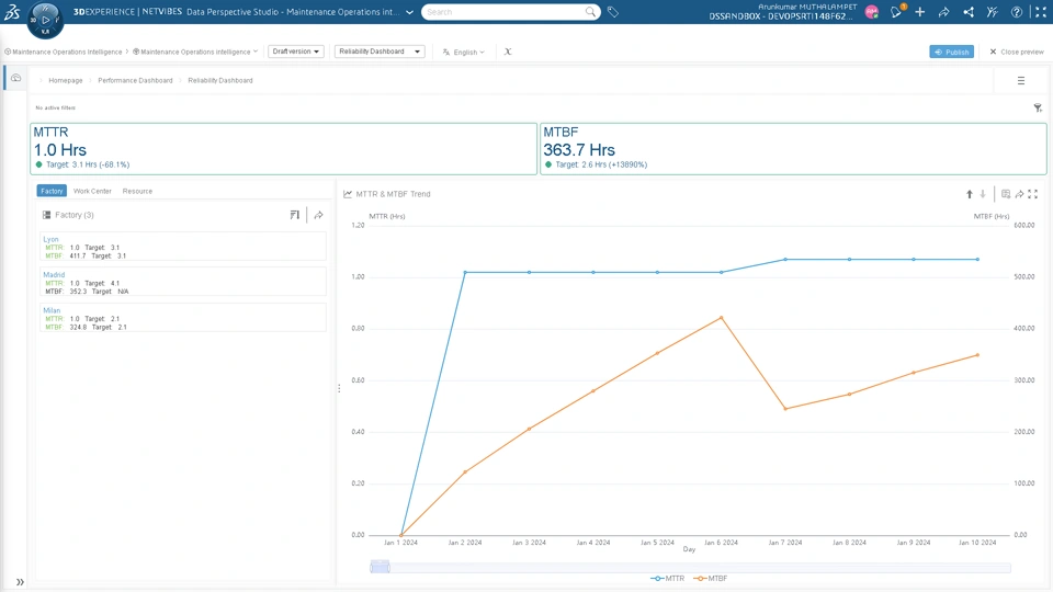 Functional Value - Empower maintenance teams with data insights to optimize performance and prevent equipment failures on the shop floor User Experience Value - Incorporate all Operations Management Data Perspectives apps to facilitate comprehensive analysis of shop floor activities I Analyze maintenance order execution efficiency and view equipment KPIs. I Compare and view history of vital equipment KPIs. I Observe maintenance order timeliness trend over time.