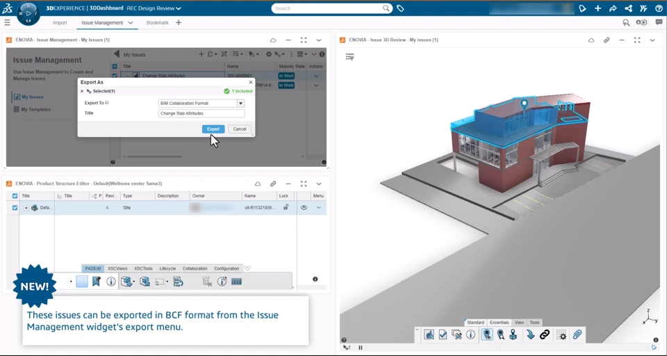 Functional Value Support of extended collaboration scenario for Building Information Modeling (BIM) Management thanks to issue export in BCF format. Support of Railway construction & maintenance projects with the import & management of IFC 4x3 Railway specific entities. I Issues can be exported in BCF format from the Issue Management widget's export menu I Extended collaboration scenarios for Building Information Modeling (BIM) Management are enhanced with issue export in BCF format
