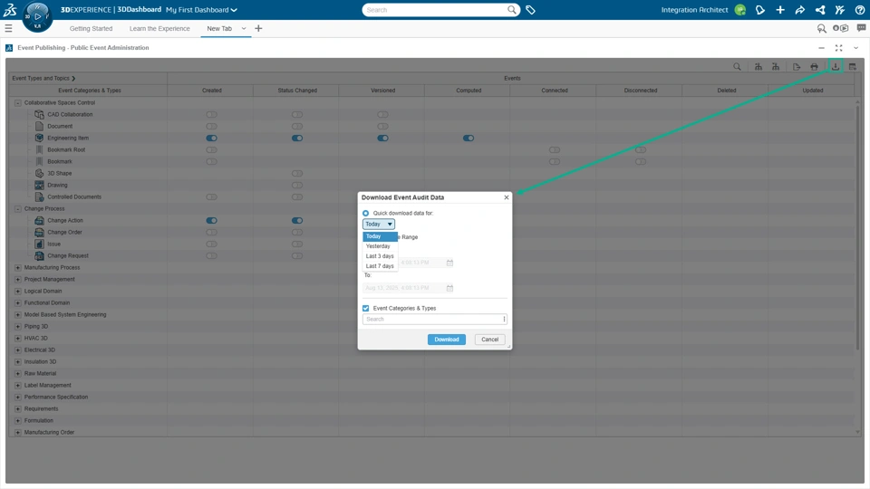Functional Value Event publishing widget now support event audit to ensure transparency, accountability, reliability, and simplifies troubleshooting in case of event delivery failures API Gateway Management app now supports many new API catalogs such as Routes, Documents, Delmia types etc. offering enhanced flexibility for efficient data management across services, ensuring scalability on the 3DEXPERIENCE platform I Enable Event Auditing from 'Event Publishing Preference' settings I