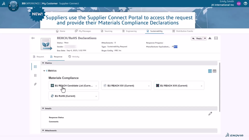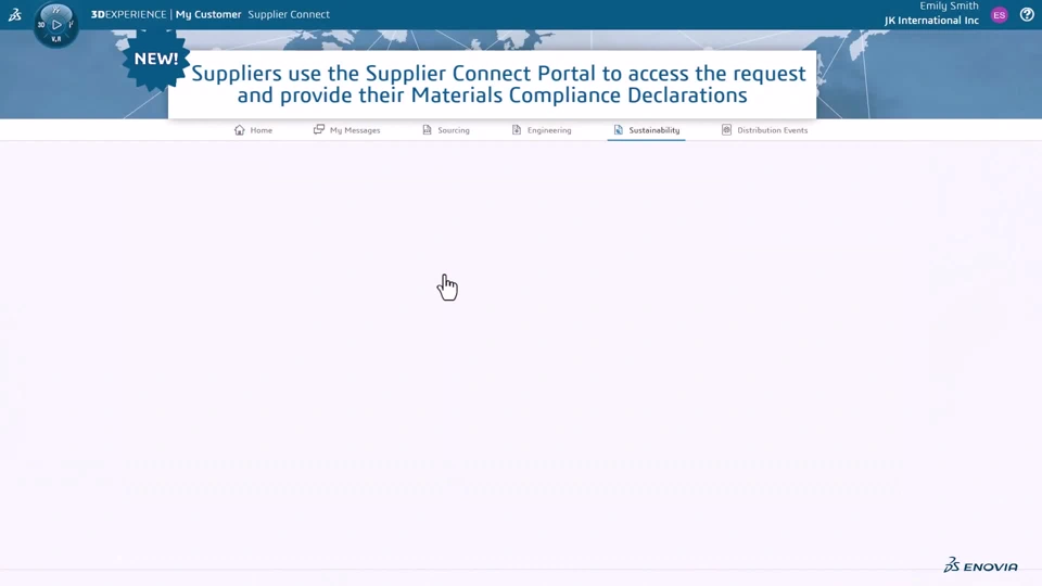 Functional Value A new request type, Sustainability, will be available in the Supplier Request Manager application. This allows users to request Suppliers to complete Sustainability / Compliance requests including Weight requests (Sustainability) and Class "A" Material Compliance declarations directly in the Supplier Portal. I
