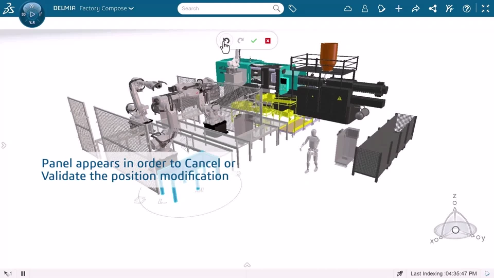 User Experience Value Build and iterate on factory layouts with speed by intuitively manipulating resources in 3D. By removing the wait time after an object is selected, the design process becomes significantly faster and more efficient. I Undo / Redo functionality for resource position I User Experience Improvement : New move manipulator
