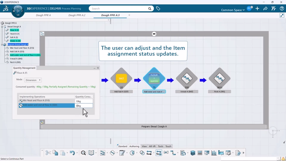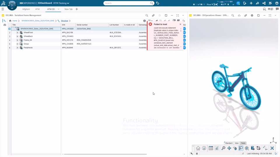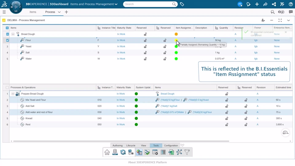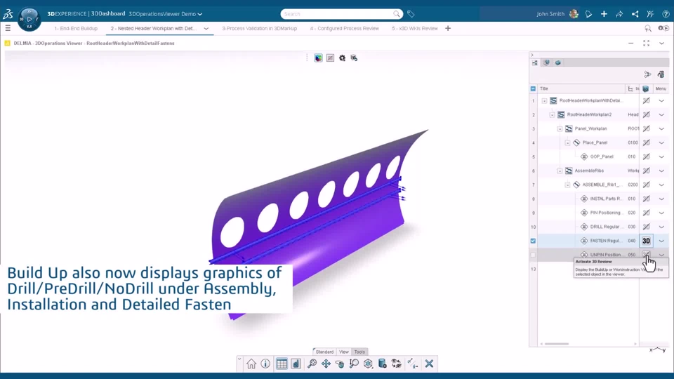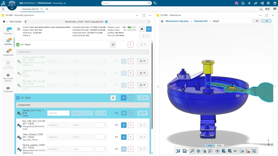 Functional Value - Improve end-to-end efficiency and reduce errors in assembly operations by integrating DELMIAWorks customer quotes and project management with assembly execution. - Streamline the assembly process and reduce search time with enhanced 3D workbook interactions. The ability to cross-highlight components instantly connects the 3D model with the parts list. I Showcase of cross highlight capabilities between Assembly Operations and 3D Workbook I Example of a item being