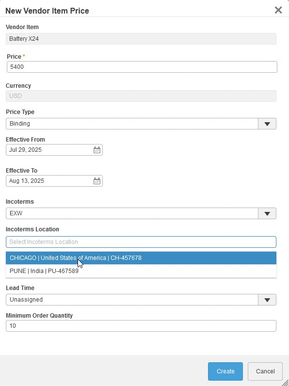 Functional Value To maintain digital continuity with downstream systems such as ERP, RFX users and Suppliers can enter both the production and receiving sites. This information will be available as part of our available API's and will provide the needed information to downstream tools to support procurement processes. I What's new RFX: Vendor Item Price for Incoterm Location I What's new RFX: Supplier portal adding Incoterm location to quotation