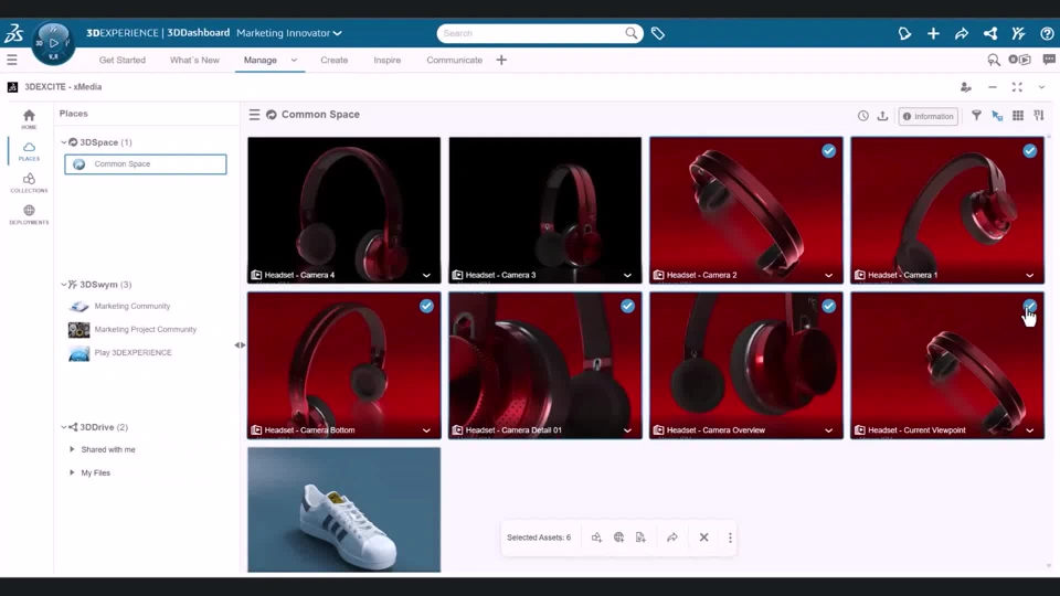 Functional Value- Enhanced Asset Preview and Comparison Capabilities Preview deployed xMedia experiences without affecting usage credits. Easily compare 2D and 2.5D assets across 3DDrive, 3DSwym, and 3DSpace for efficient validation. - Batch Deployment and Publishing Deploy multiple experiences simultaneously and publish assets from Collections, minimizing manual effort and enhancing content delivery. - Efficient Asset Management in Collections Add or remove multiple assets at once in