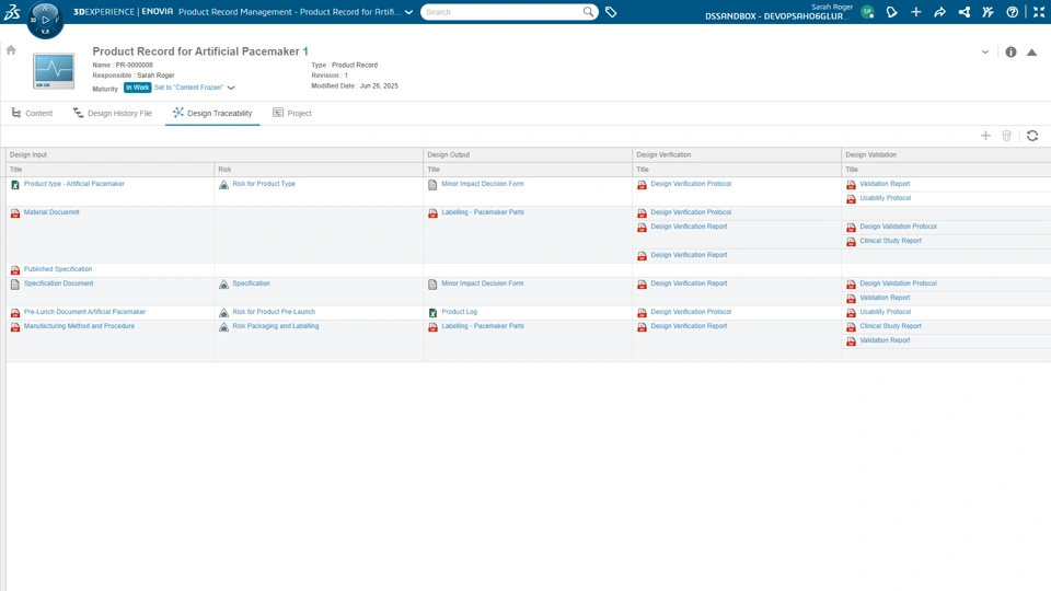 Functional Value Manage product record for any type of Design Controls to ensure Product Record content is compliant to Quality & Regulatory standards. User Experience Value intuitive user interface to manage the Product Record & secure distribution. I Auto sync of Tasks and update DHF Elements I Enhanced UX of Design Traceability