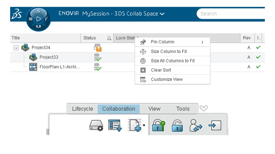 User Experience Value Benefit from a new user interface on MySession panel I The "My Session" panel interface is redesigned to enable users enhanced to organize panel columns and access information. Additionally, the toolbar is upgraded with a new Collaboration section, consistent with the user experience of 3DEXPERIENCE widgets.