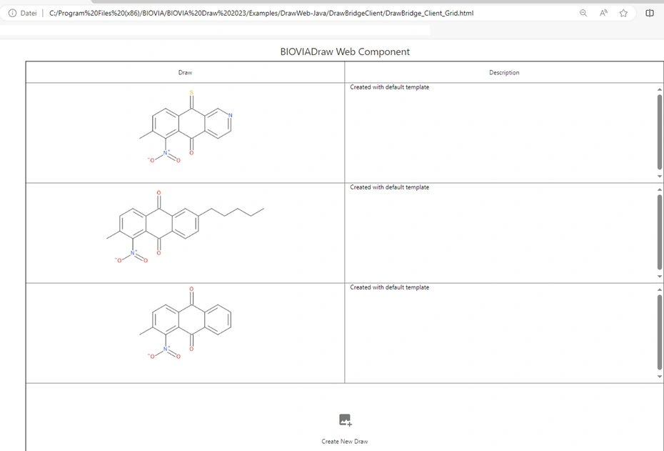 BIOVIA Draw Enterprise (EE) provides an integration option with web applications that is called „DrawBridge“. With DrawBridge you can open Draw from a web application and transfer structures between them. The DrawBridge executable is automatically installed on the client with all installations of Draw EE. Sample HTML/JS pages exist for rendering of single structures or structures in a grid. When „developer mode“ is selected during installation of BIOVIA Draw EE, coding examples and developer