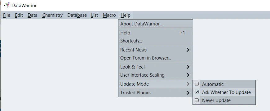 I would like to suggest an extension of the editor's help menu by an entry which informs the user about a new release of Biovia Draw. Similar to DataWarrior, the preferred implementation would allow the user to select among launching an automatic update in the background, requesting a decision if the user wants an update, or not to search for updates (e.g., because of local IT policy) at all: