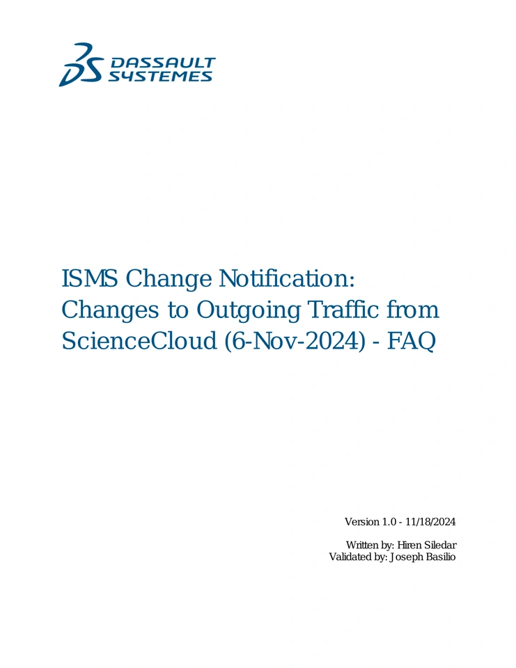 There is a change in BIOVIA ScienceCloud Information Security Management System (ISMS) process. ScienceCloud’s mission is to protect the confidentiality, integrity and availability of customer data. To help us achieve this mission and improve security on ScienceCloud we are making changes to outgoing traffic from over data centers. Over the next three months, we will be making changes to block all outgoing traffic from our data centers. We will start by blocking all outgoing traffic except on