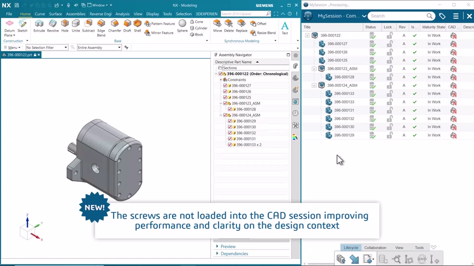 Support for NX2412 allows users take advantage of new CAD functionality. The 'Update Revisions' option in MySession updates the product structure to the latest revision, ensuring users are working with the most up-to-date data in the CAD session. Engineering Items that are only relevant to the Engineering Item Definition are excluded when opening into CAD allowing users to focus on the design context.