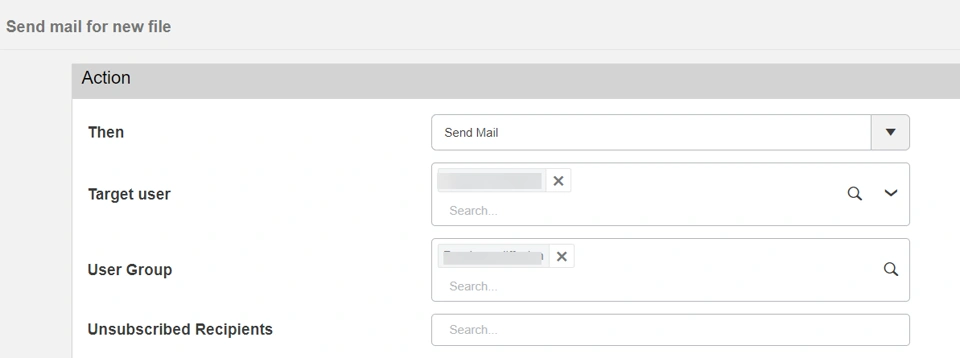 A potion owner can view and edit the list of unsubscribed recipients in the potion Send mail action in the added Unsubscribed Recipients field.