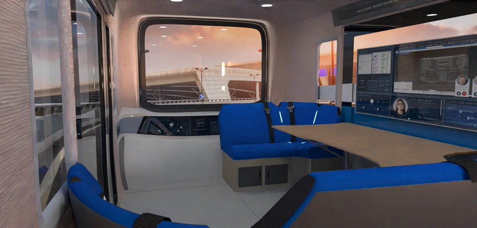 While traveling, the shuttle can for example pick you up and allow you to use your travel time for activities like shopping or working. The shuttle is designed to offer convenience and flexibility, making various experiences more accessible.