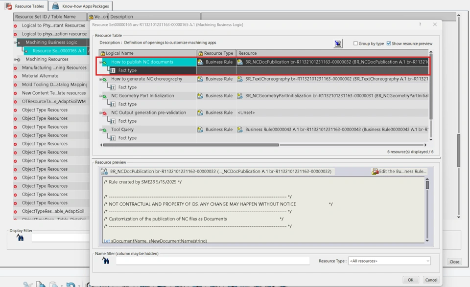 This business rule is for defining how the NC files generated should be published on Manufacturing Program. It is already implemented with some basic settings in the installation folder of 3dExperience Platform. In this page we will see how we can modify this business rule to implement additional settings for the documents that are generated when NC files are published.