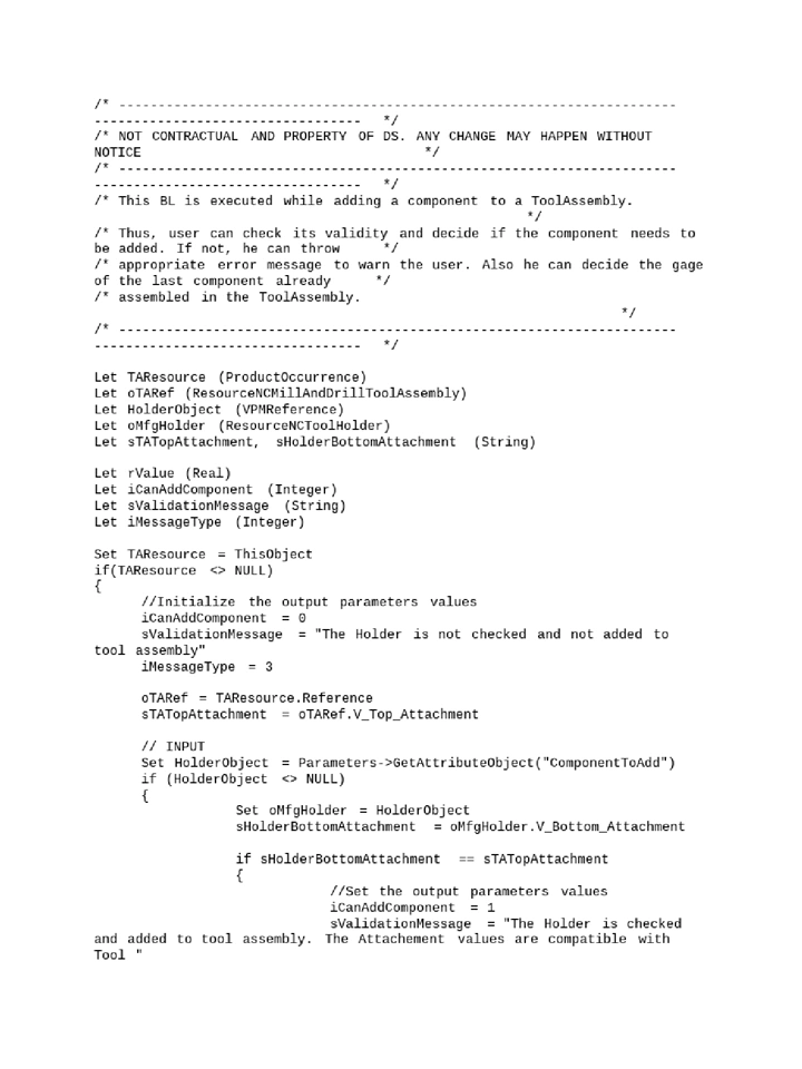Set HolderObject = Parameters->GetAttributeObject("ComponentToAdd")Implement the Check. Here we are checking whether the bottom attachment type on holder is same as the top attachment type for tool assembly which is propagated from attachment type on topmost tool/holder component in tool assembly.